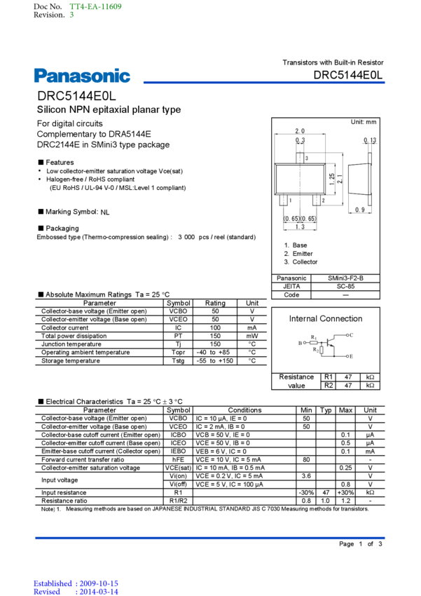 DRC5144E Transistor with Built-in Resistors (IC = 100 mA Series)