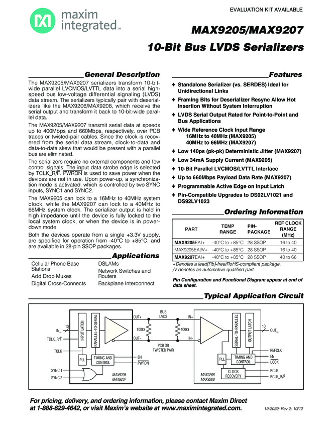 MAX9205 MAX9205, MAX9207 10-Bit Bus LVDS Serializers