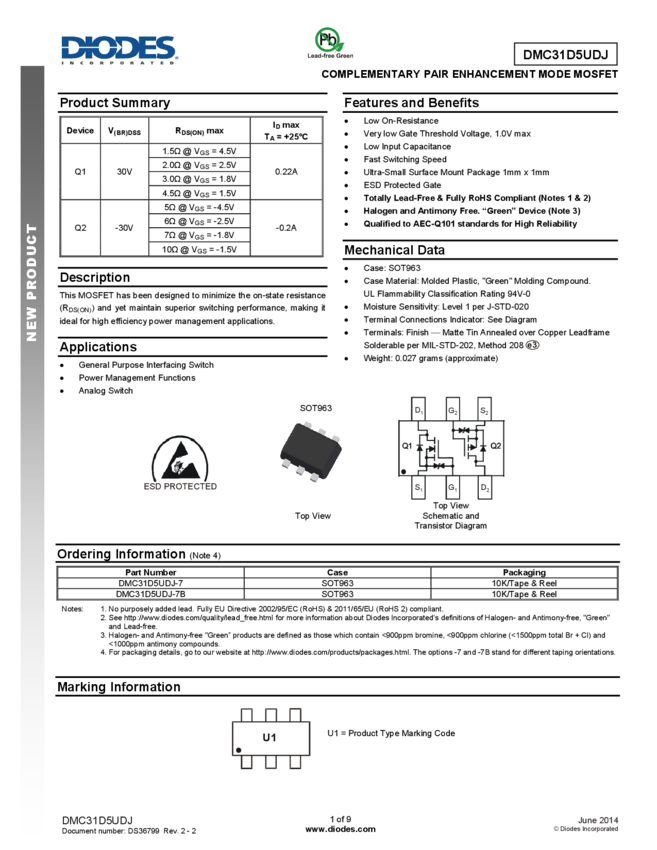DMC31D5UDJ COMPLEMENTARY PAIR ENHANCEMENT MODE MOSFET