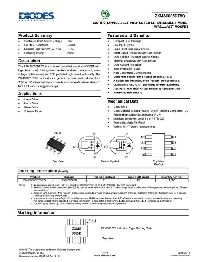 ZXMS6005DT8Q 60V N-CHANNEL SELF PROTECTED ENHANCEMENT MODE