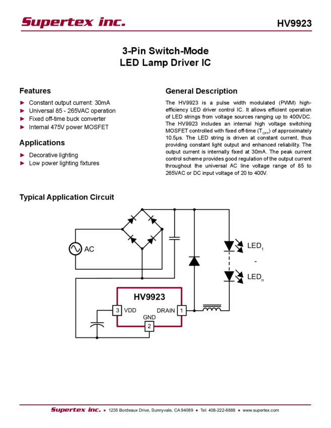 HV9923 Datasheet - 3-Pin Switch-Mode LED Lamp Driver (04/06/2011)