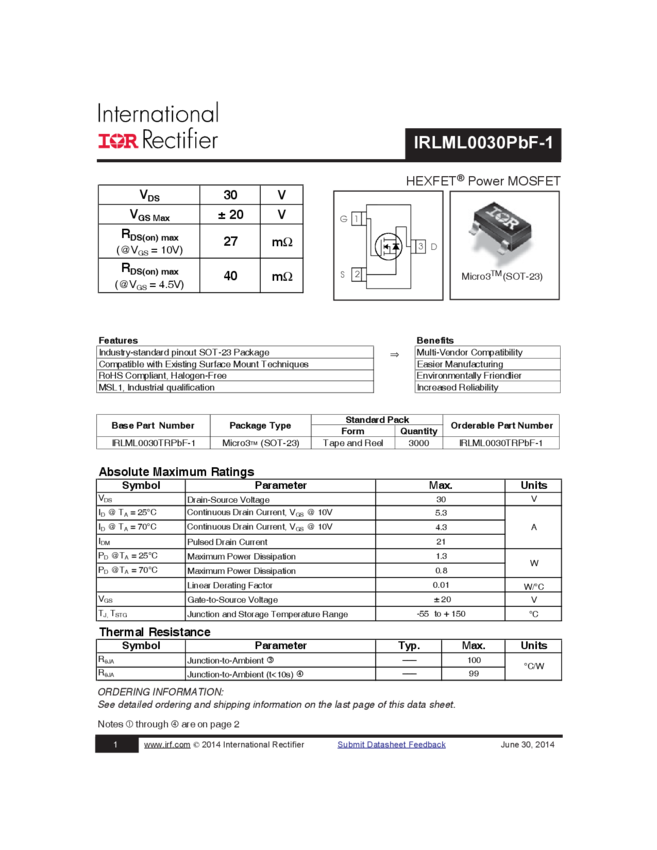 IRLML0030PBF-1 N-Channel 10-30V Transistor