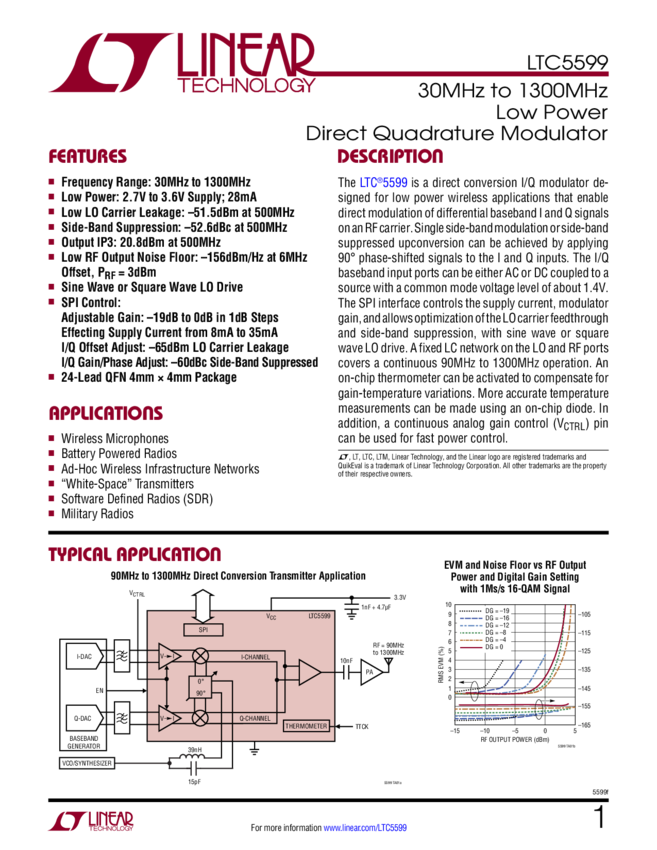 LTC5599 30MHz to 1300MHz Low Power Direct Quadrature Modulator