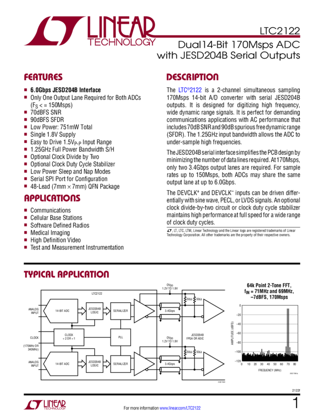 LTC2122 Dual14-Bit 170Msps ADC with JESD204B Serial Outputs