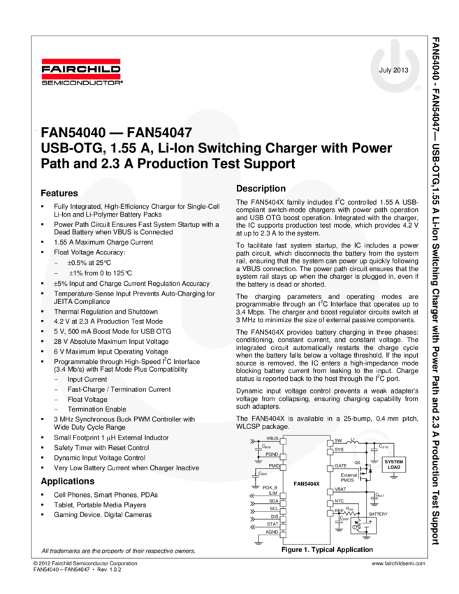 FAN54046 USB-OTG, 1.55A, Li-Ion Switching Chargers with Power Path and 2.3A Producti...