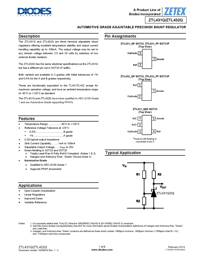 ZTL431Q AUTOMOTIVE GRADE ADJUSTABLE PRECISION SHUNT REGULATOR