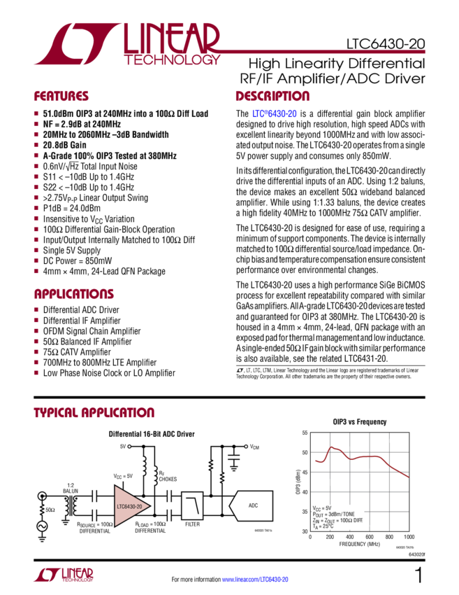 LTC6430-20 High Linearity Differential RF/IF Amplifier/ADC Driver