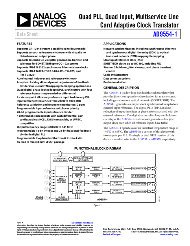 AD9554-1: Quad PLL, Quad Input, 4-output Multiservice Line Card Adaptive Clock Translator