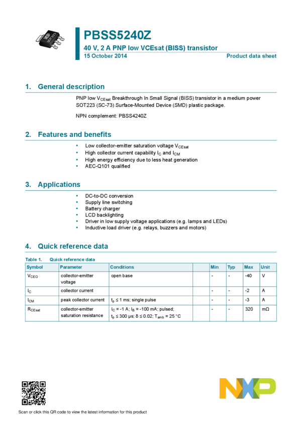 PBSS5240Z 40 V, 2 A PNP low VCEsat (BISS) transistor