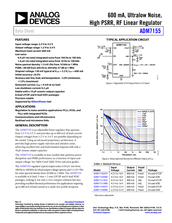 ADM7155: 600 A, Ultralow Noise, High PSRR, RF Linear Regulator