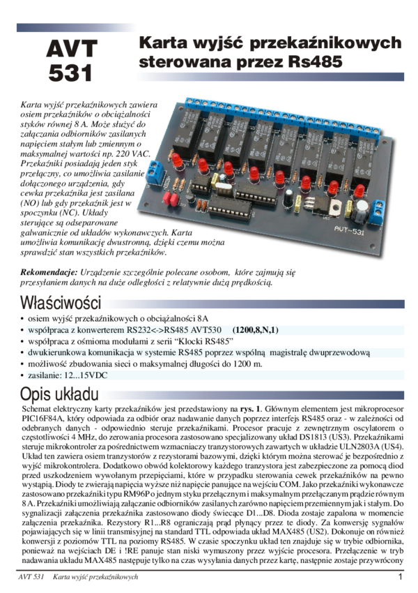 AVT531 Klocki RS485 - karta wyjść przekaźnikowych