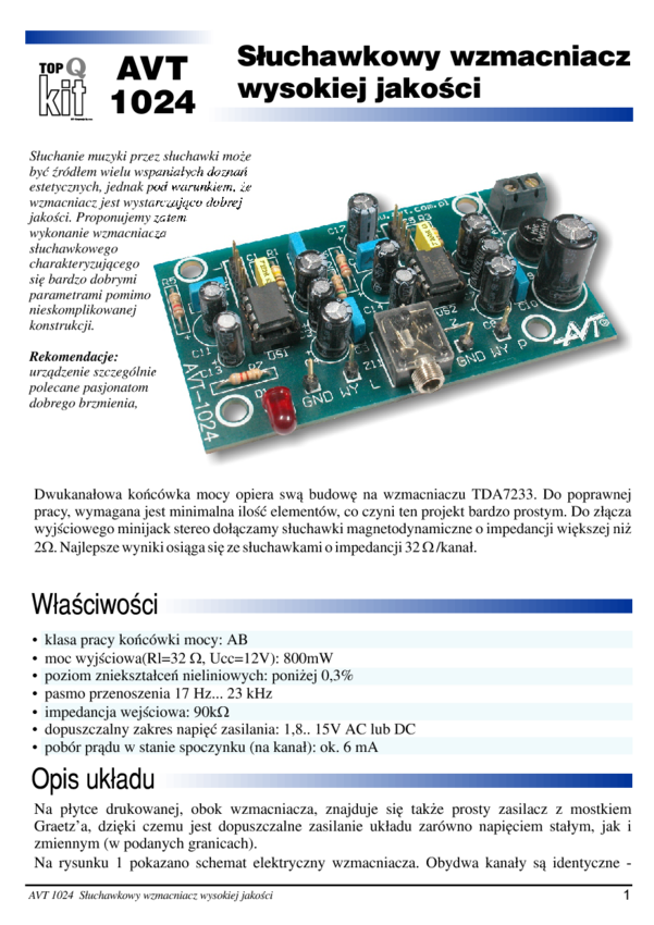 AVT1024 Słuchawkowy wzmacniacz wysokiej jakości