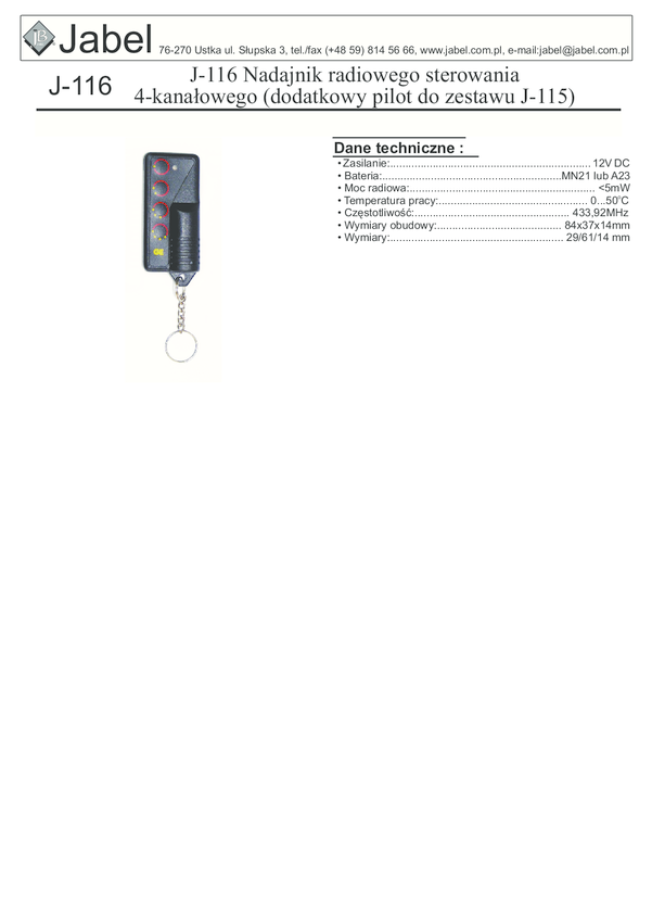 J116 J-116 Pilot 4-klawiszowy ze zmiennym kodem (do J-115)