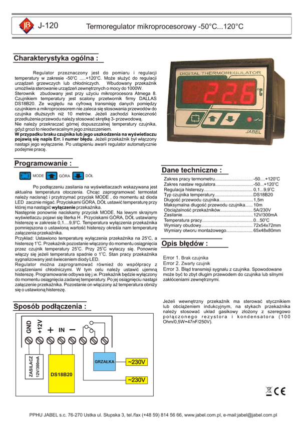 J120 J-120 Termoregulator mikroprocesorowy -50°C … +120°C (obudowa panelowa)