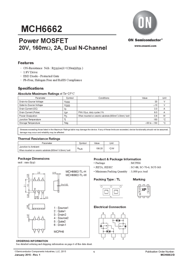 MCH6662 Power MOSFET, 20V, 160mΩ, 2A, Dual N-Channel