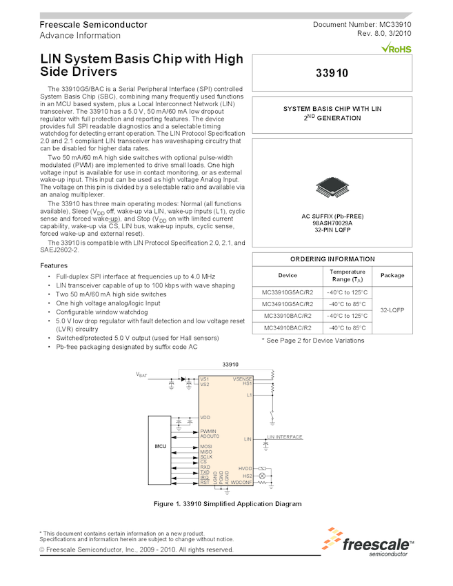 MC33910: LIN System Basis Chip with 2x60 mA High Side Drivers