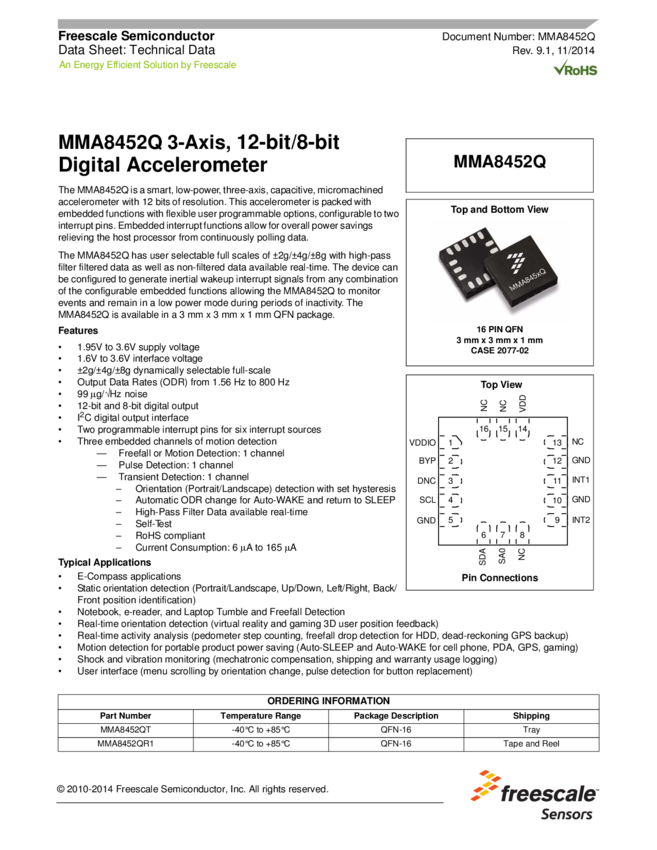 MMA8452Q ±2g/±4g/±8g, Low g, 12-bit Digital Accelerometer