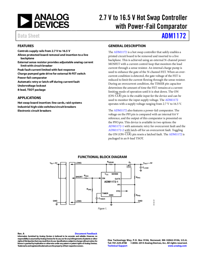 ADM1172 2.7 V to 16.5 V Hot Swap Controller with Power-Good Comparator