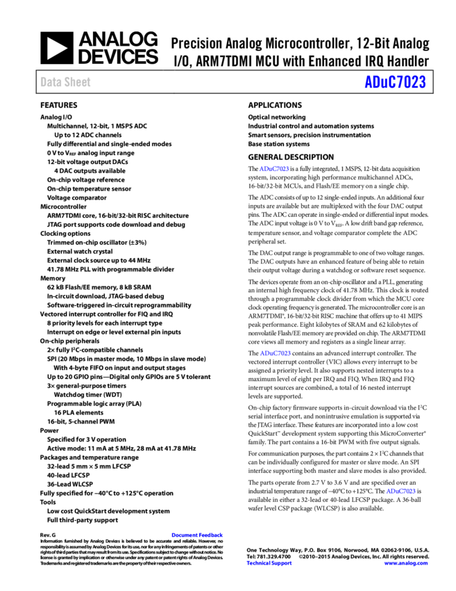 ADUC7023 Precision Analog Microcontroller, 12-Bit Analog I/O, ARM7TDMI MCU with Enha...