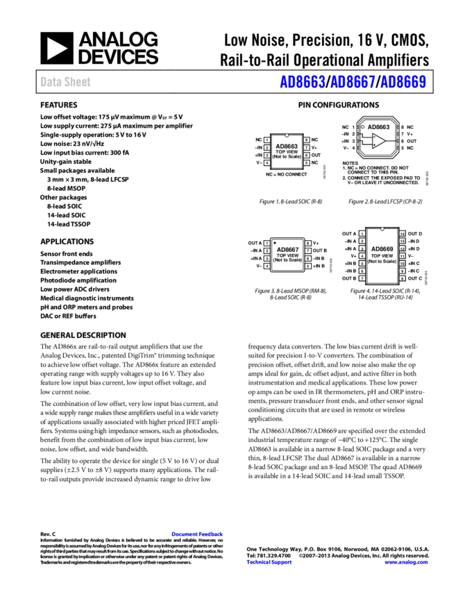 AD8663 Low Noise, Precision, 16 V, CMOS, Rail-to-Rail Operational Amplifier
