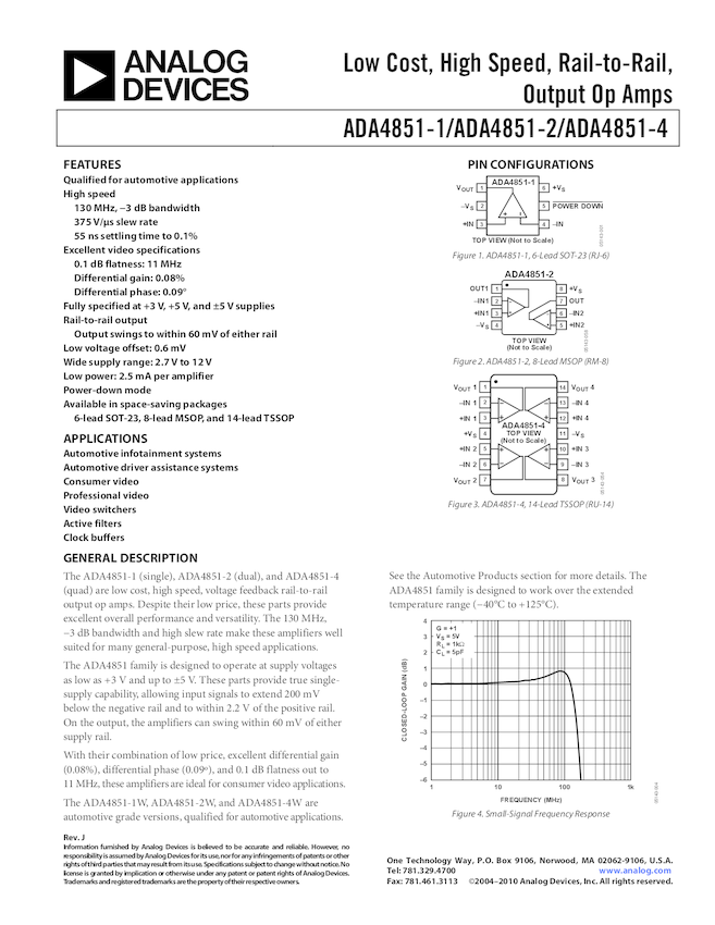 ADA4851-1 Low Cost, High Speed, Rail-to-Rail, Output Op Amp (Single)