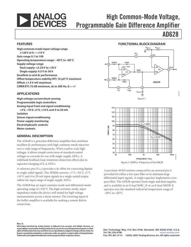 AD628 High Common-Mode Voltage, Programmable Gain Difference Amplifier