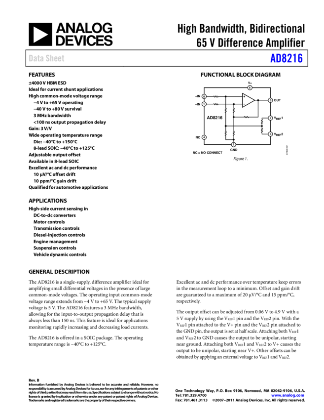 AD8216 High Bandwidth, Bidirectional 65 V Difference Amplifier