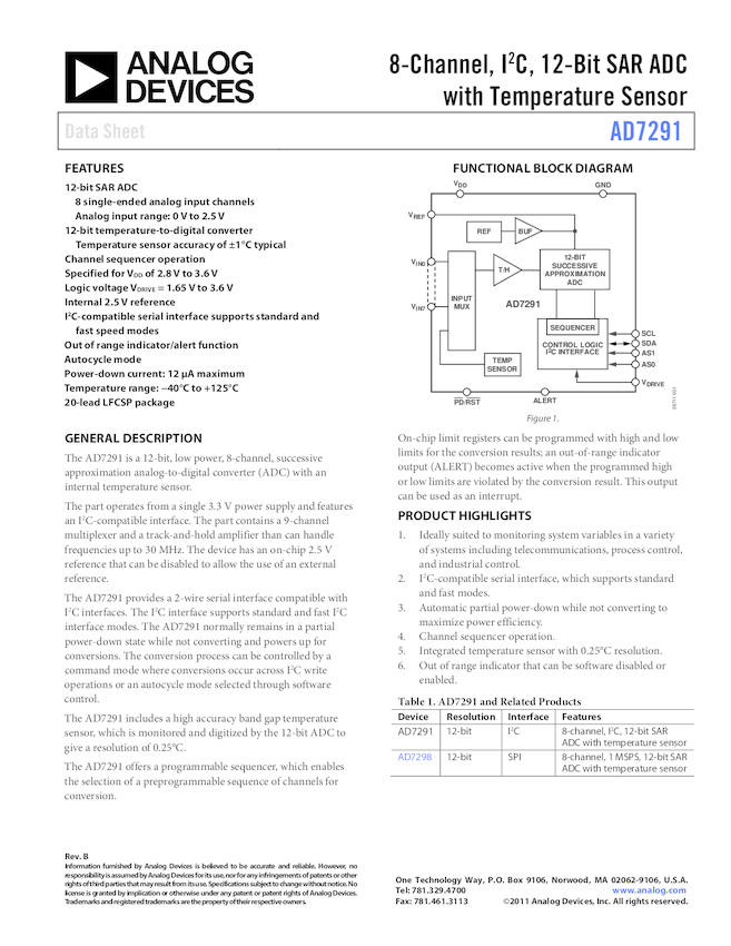 AD7291 8-Channel, IC, 12-Bit SAR ADC with Temperature Sensor