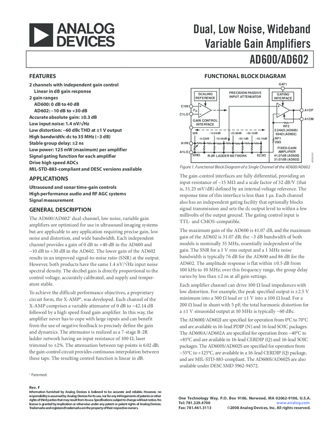 AD600 Dual, Low Noise, Wideband Variable Gain Amplifier, 0 B To +40 B Gain