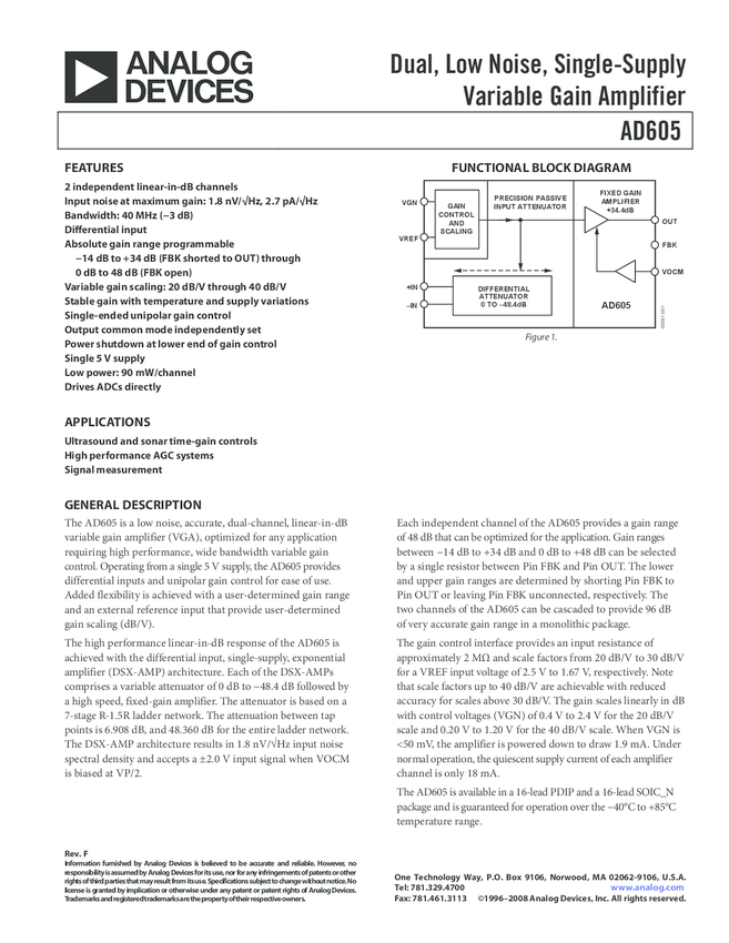 AD605 Dual, Low Noise, Single-Supply Variable Gain Amplifier
