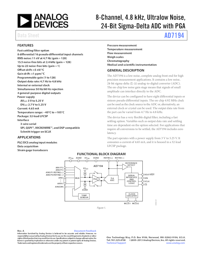 AD7194 8-Channel, 4.8 kHz, Ultralow Noise, 24-Bit Sigma-Delta ADC with PGA