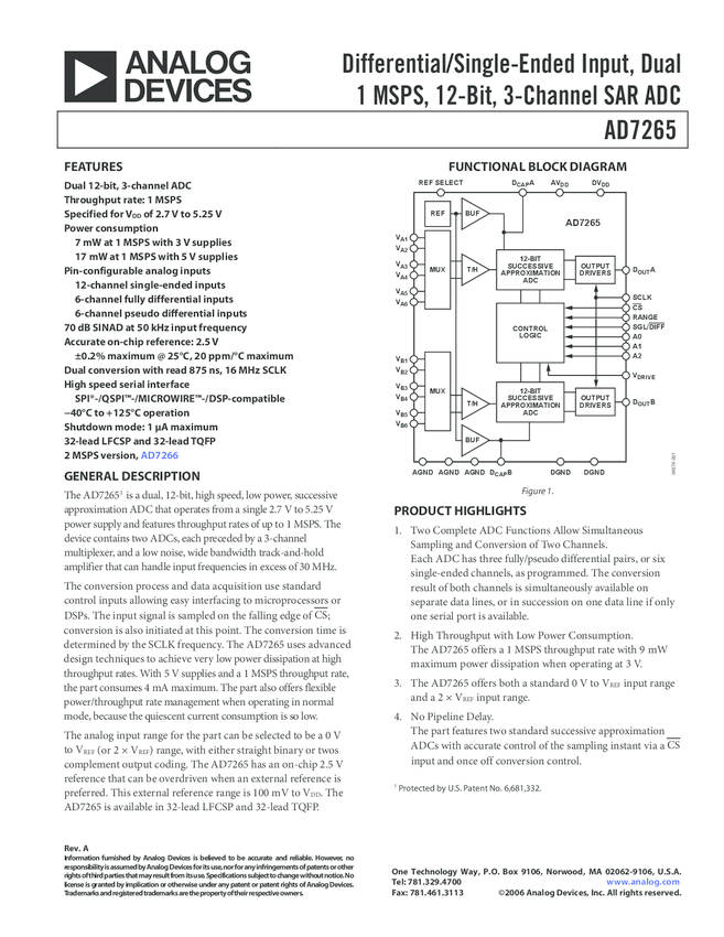 AD7265 Differential/Single-Ended Input, Dual 1 MSPS, 12-Bit, 3-Channel SAR A/D Con...