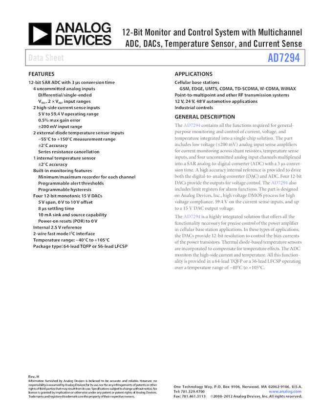 AD7294 12-Bit Monitor and Control System with Multichannel ADC, DACs, Temperature...