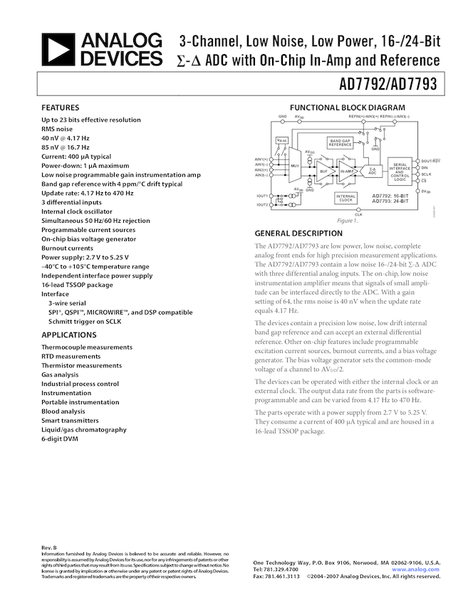 AD7793 3-Channel, Low Noise, Low Power, 16-Bit Sigma Delta ADC with On-Chip In-Amp...