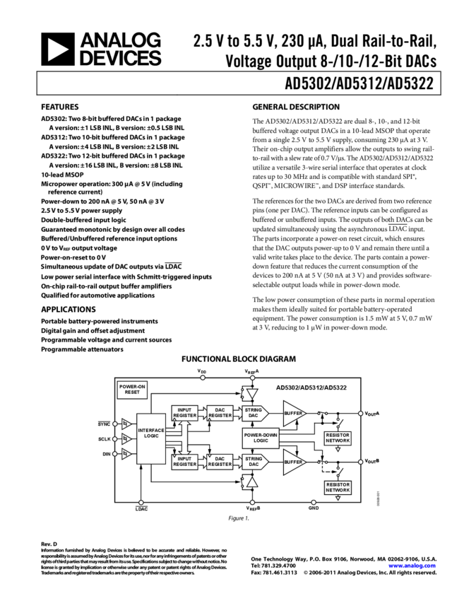 AD5322 2.5 V to 5.5 V, 230 A, Dual Rail-to-Rail Voltage Output 8-Bit DAC in a 10-L...