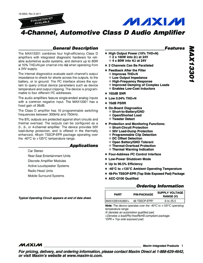 MAX13301 4-Channel, Automotive Class D Audio Amplifier