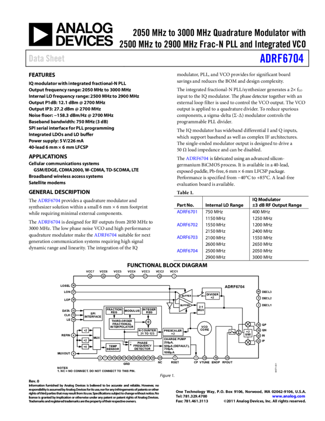 ADRF6704 2050 MH TO 3000 MH Quadrature Modulator with 2500 MH TO 2900 MH Fractional-...