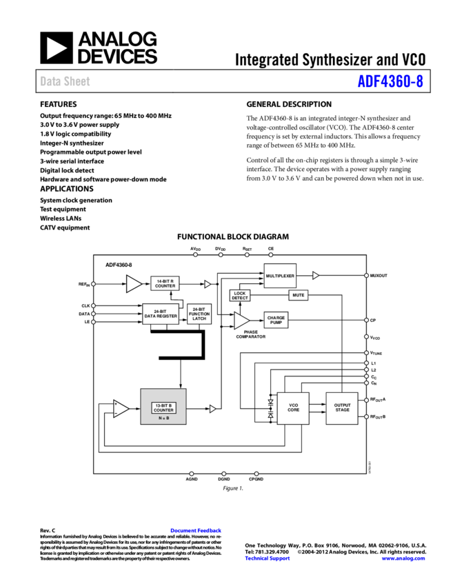 ADF4360-8 Integrated Integer-N Synthesizer and VCO - Output Frequency 65 to 400
