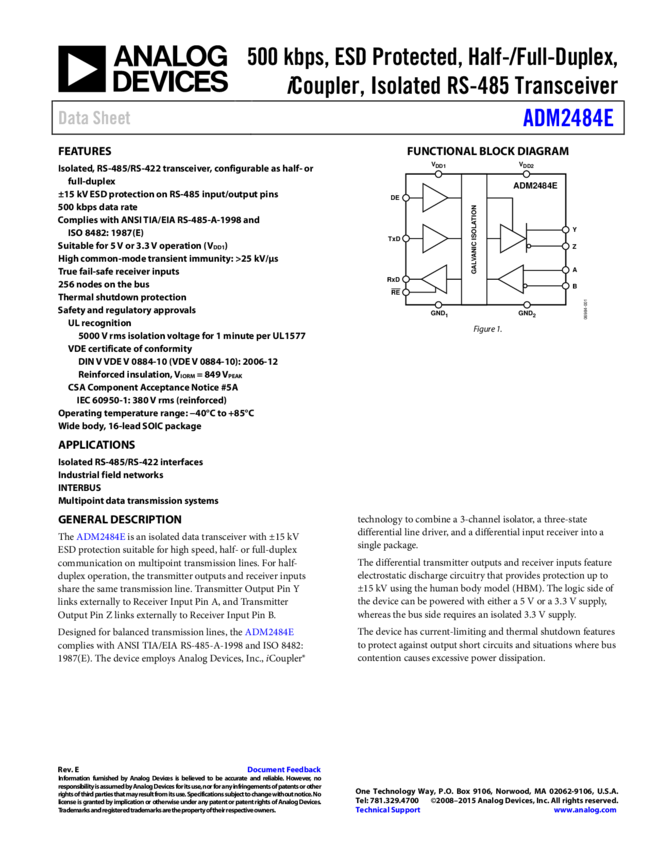 ADM2484E 5 kV Signal Isolated, ESD Protected, 500 kbps, Full/Half Duplex RS-485 Tran...