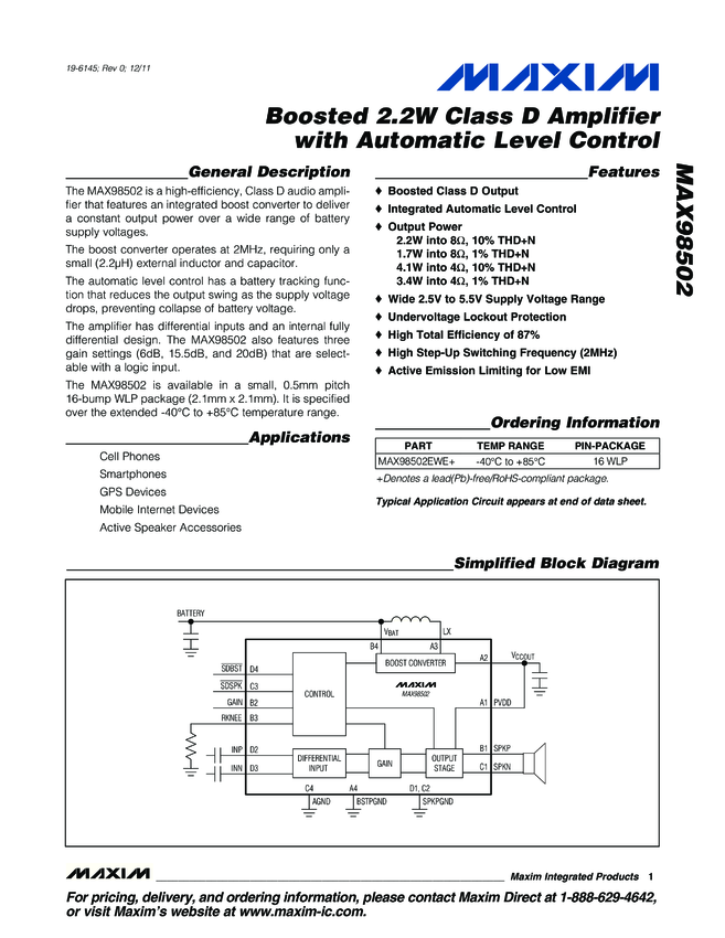 MAX98502 Boosted 2.2W Class D Amplifier with Automatic Level Control