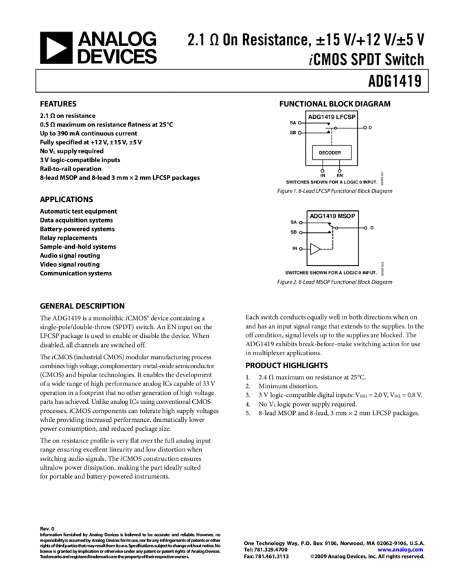 ADG1419 2.1 Ω Max On Resistance ±15 V/12 V/±5 V iCMOS SPDT Switch
