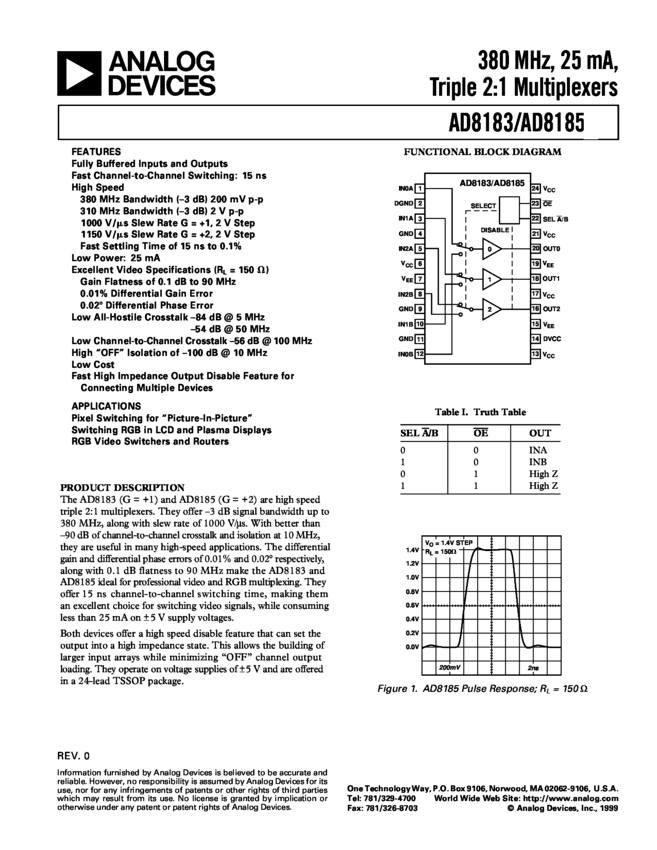 AD8183 380 MH, 25A, Triple 2:1, Buffered (Gain = +1) Multiplexer