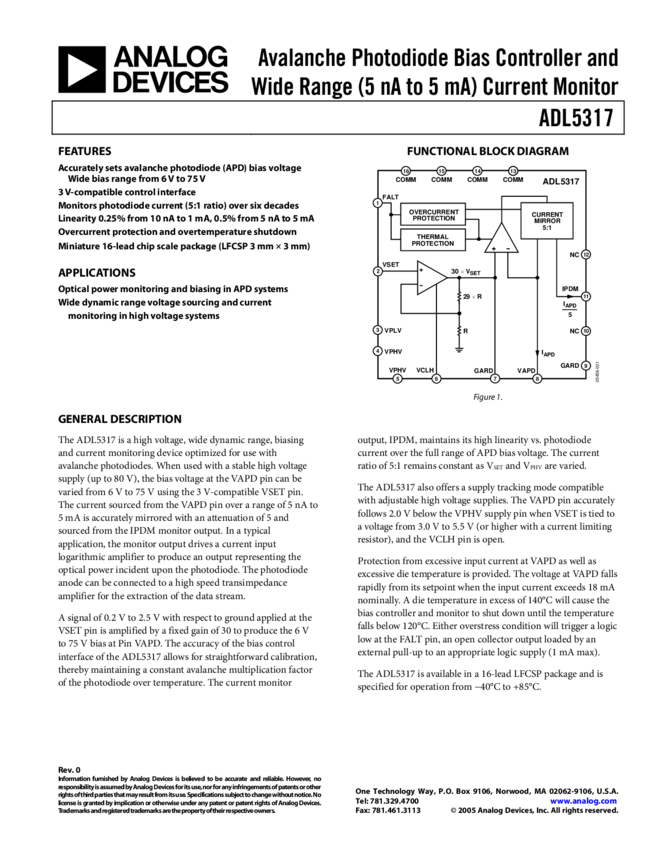 ADL5317 Avalanche Photodiode Bias Controller and Wide-range (5 ) Current Monitor