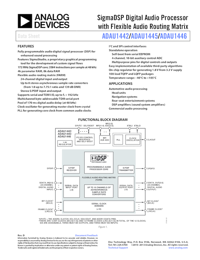 ADAU1442 SigmaDSP® Digital Audio Processor with Flexible Audio Routing Matrix
