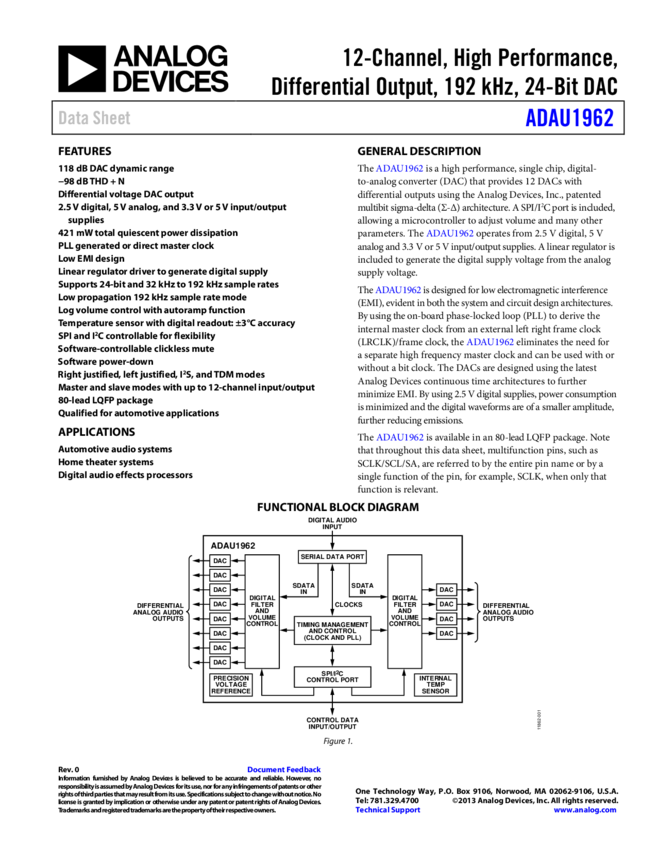 ADAU1962 12-Channel High Performance Differential Output, 192 H, 24-Bit DAC