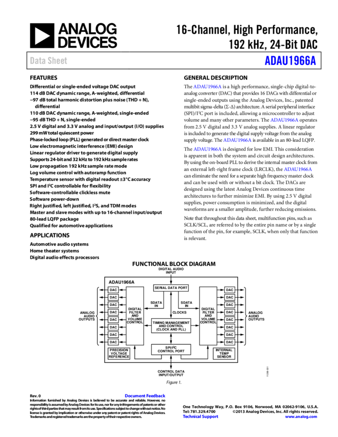 ADAU1966A 16-Channel, High Performance, 192 H, 24-Bit DAC