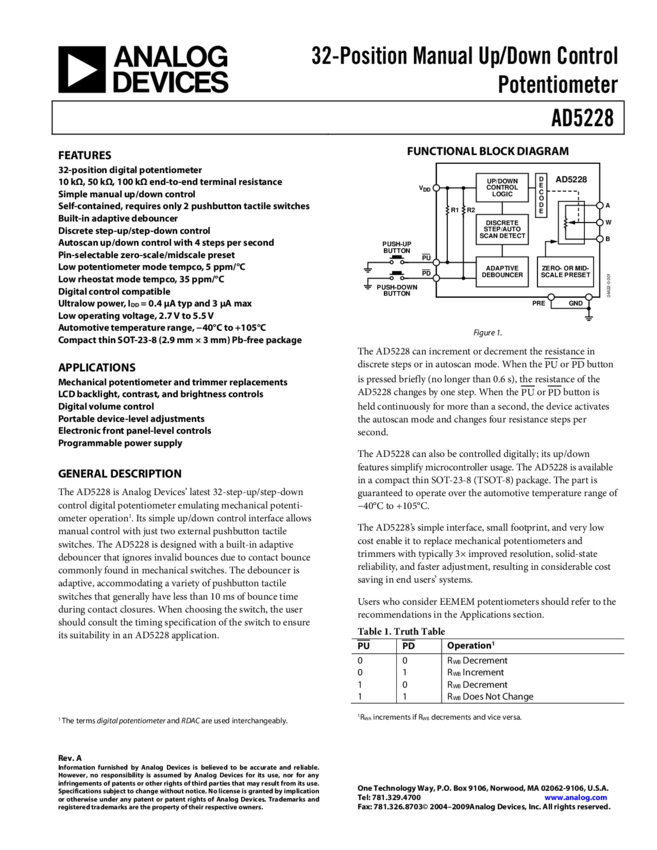 AD5228 32-Position Manual Up/Down Control Potentiometer