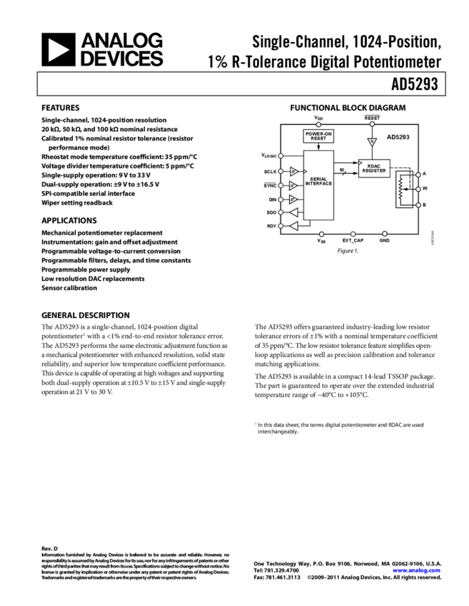 AD5293 Single Channel, 1024-Position, 1% R-Tol, Digital Potentiometer