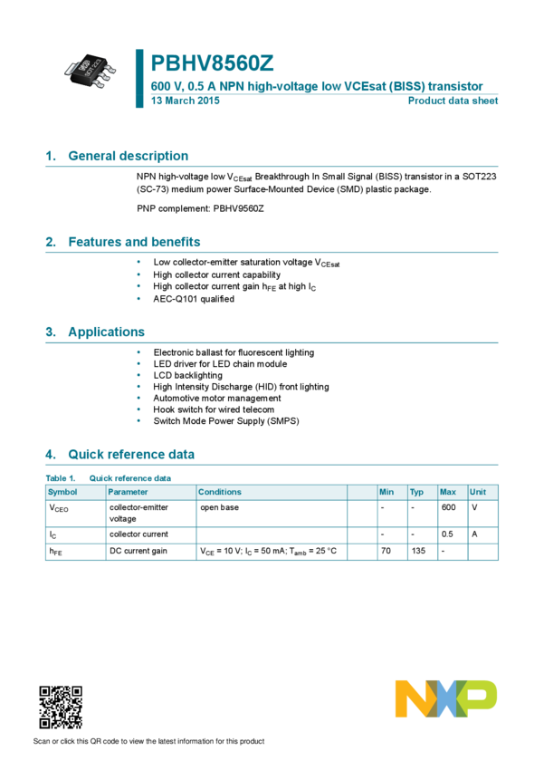 PBHV8560Z 600 V, 0.5 A NPN high-voltage low VCEsat (BISS) transistor