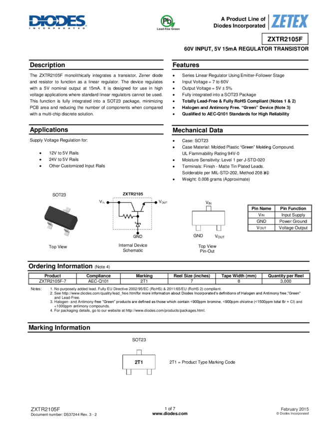ZXTR2105F 60V INPUT, 5V 15mA REGULATOR TRANSISTOR